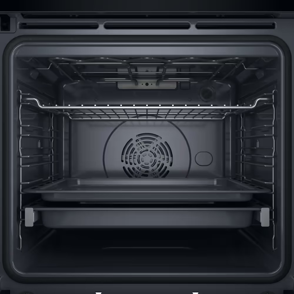 Система электронного управления с поворотными переключателями обеспечивает удобную настройку режимов и температуры. Духовой шкаф поддерживает диапазон температур от 30 до 310 °C, что позволяет использовать его как для деликатного подогрева или расстойки теста, так и для интенсивного запекания.