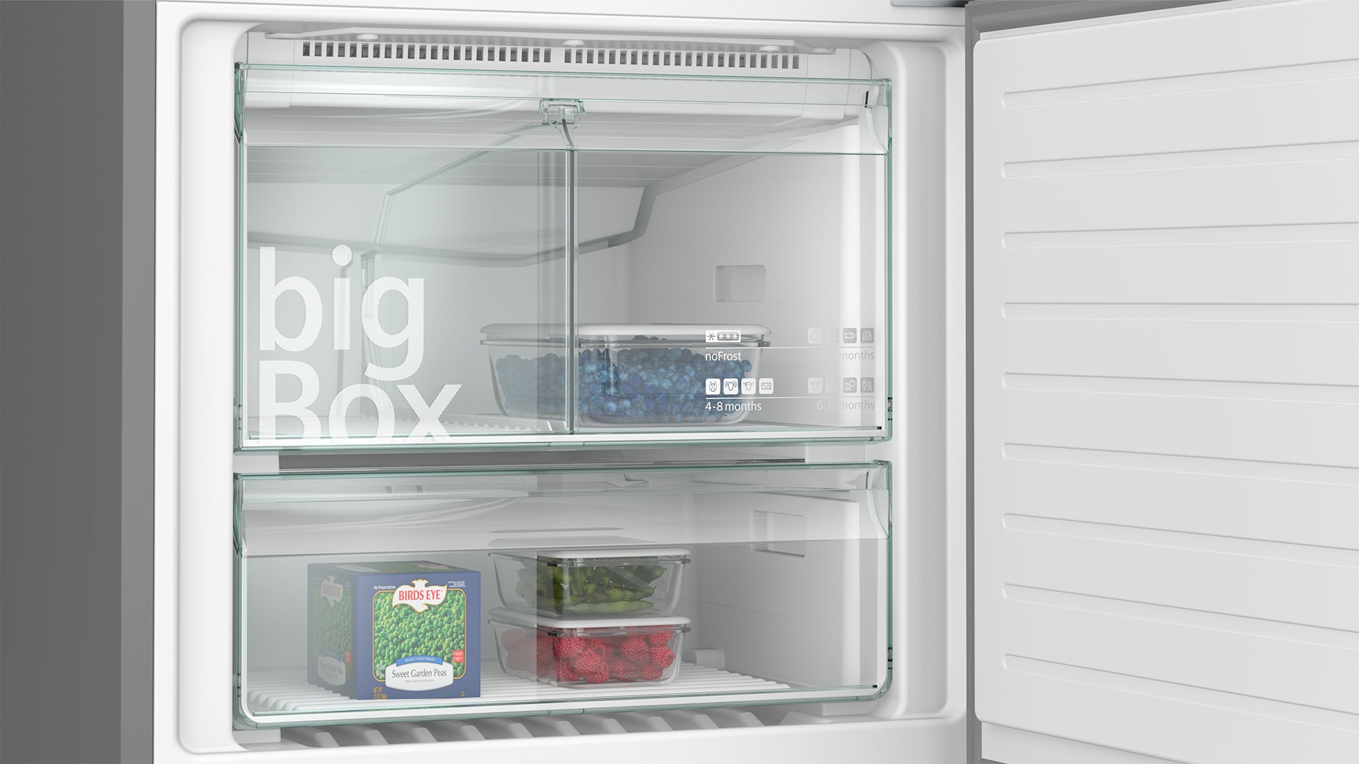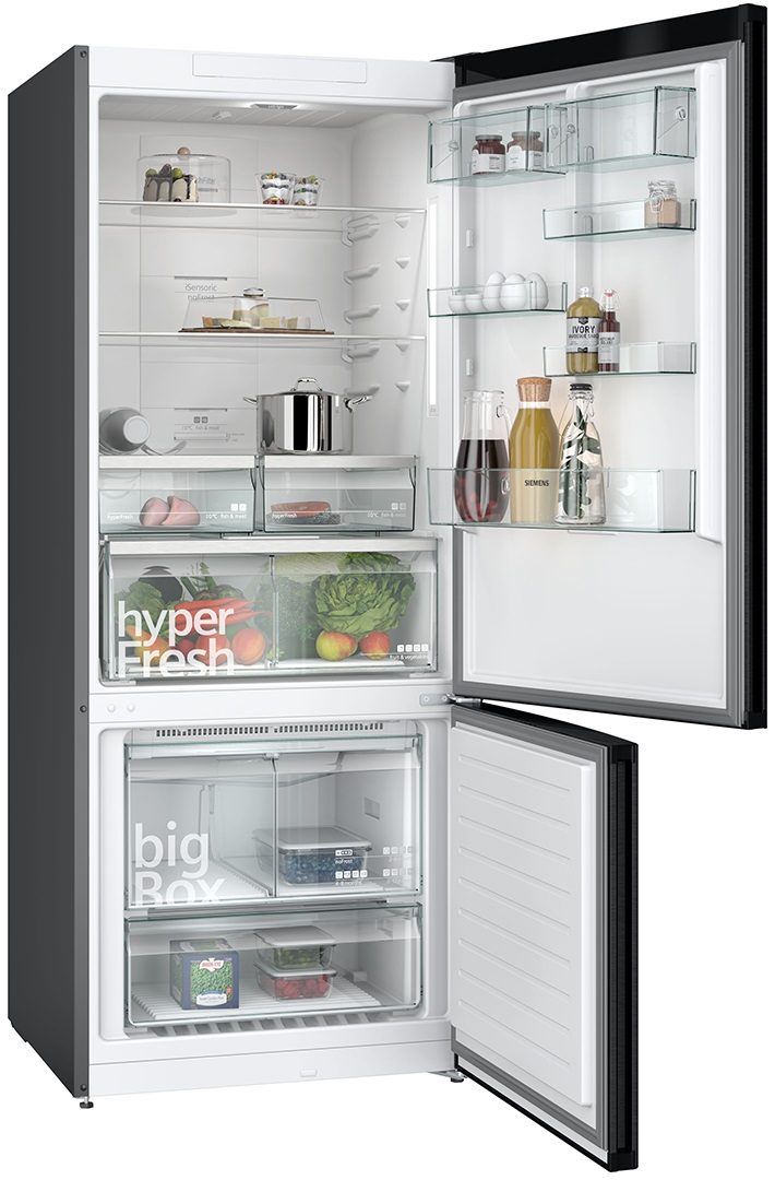 Siemens KG76NCXE0N создан для пользователей, которым важно иметь большой запас продуктов и сохранять их в максимально естественных условиях. Объём 526 л, система Total NoFrost, инверторный компрессор и двухконтурное охлаждение обеспечивают стабильную температуру на каждой полке, а зоны hyperFresh продлевают свежесть мяса, рыбы, овощей и фруктов. Модель сочетает вместительность, технологичность и стильный внешний вид из чёрной стали с покрытием против отпечатков.