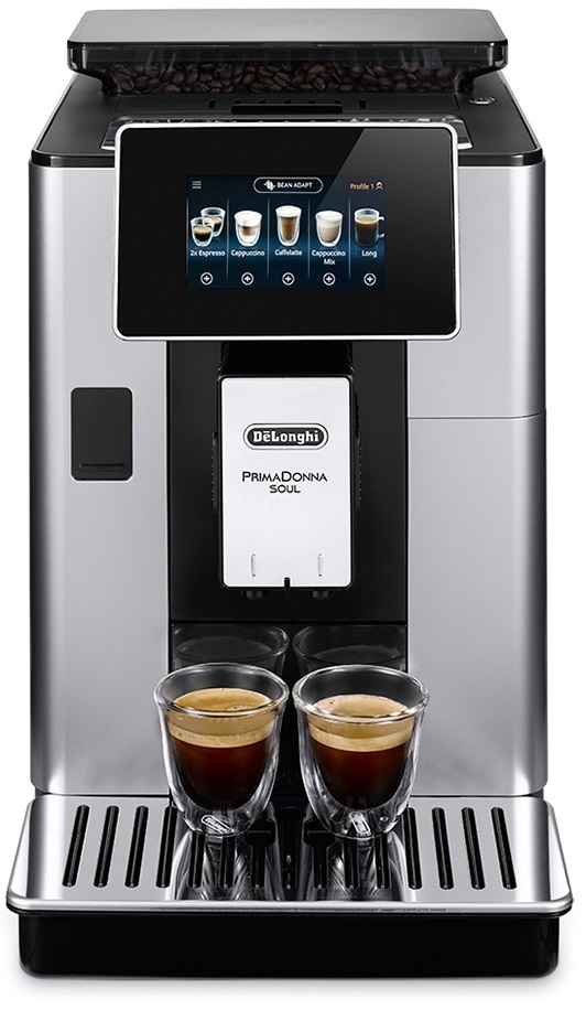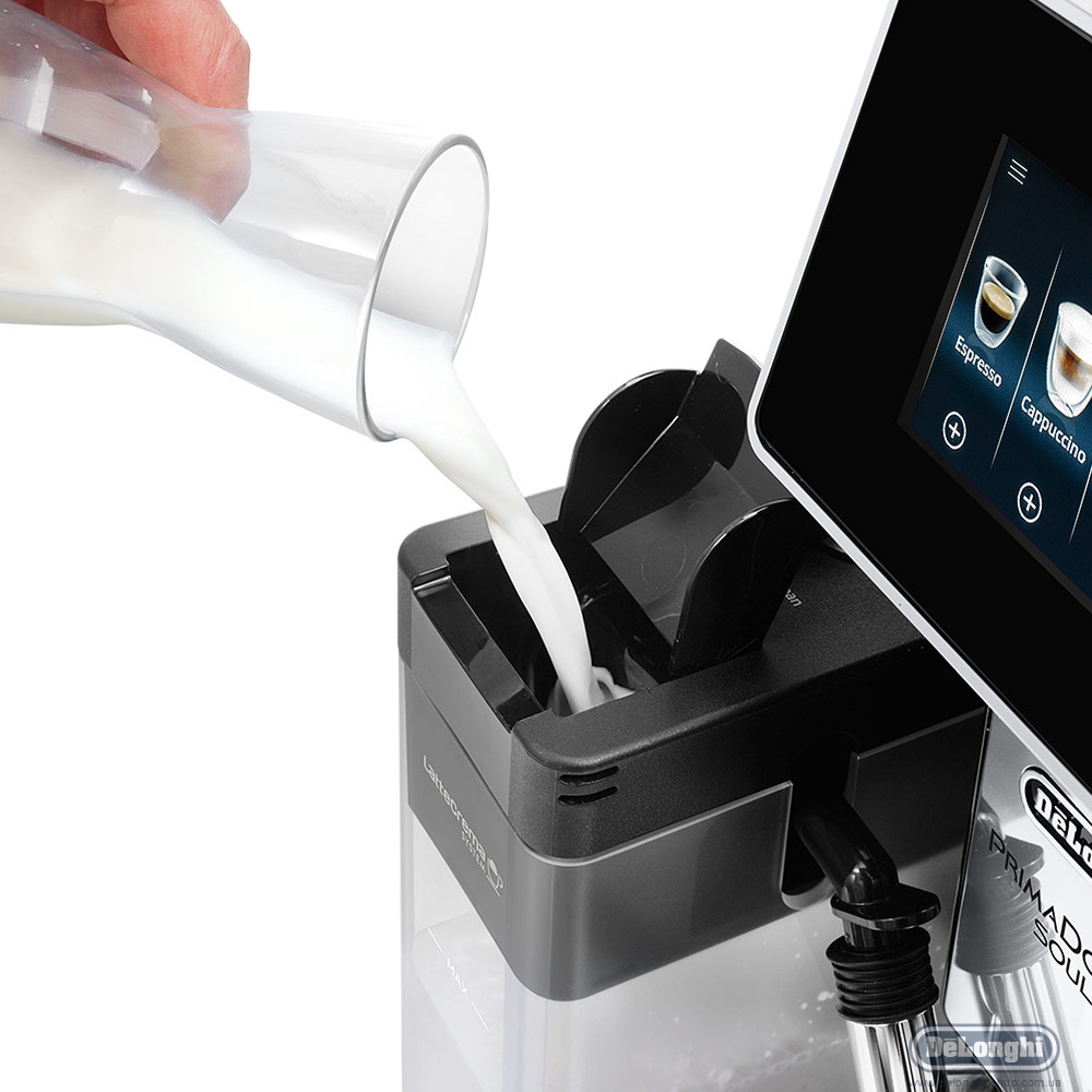Для любой «топовой» кофемашины наличие съемного капучинатора обязательно. DeLonghi ECAM 610.55 SB PrimaDonna Soul оснащена молочным контейнером с переключателем, позволяющим настраивать толщину и плотность пенки. Сама пенка образуется путем смешивания молока с перегретым, поданным под высоким давлением паром. Теперь капучино, латое, макиято или горячее молоко приготовить так же просто, как и стандартный эспрессо.