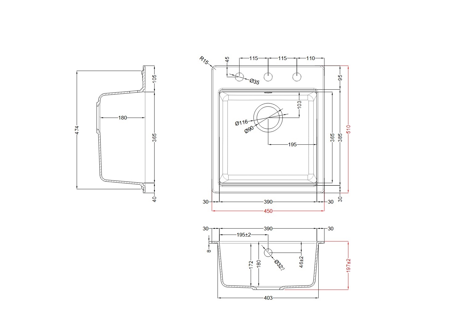 - ▪ База под мойку: 450 мм