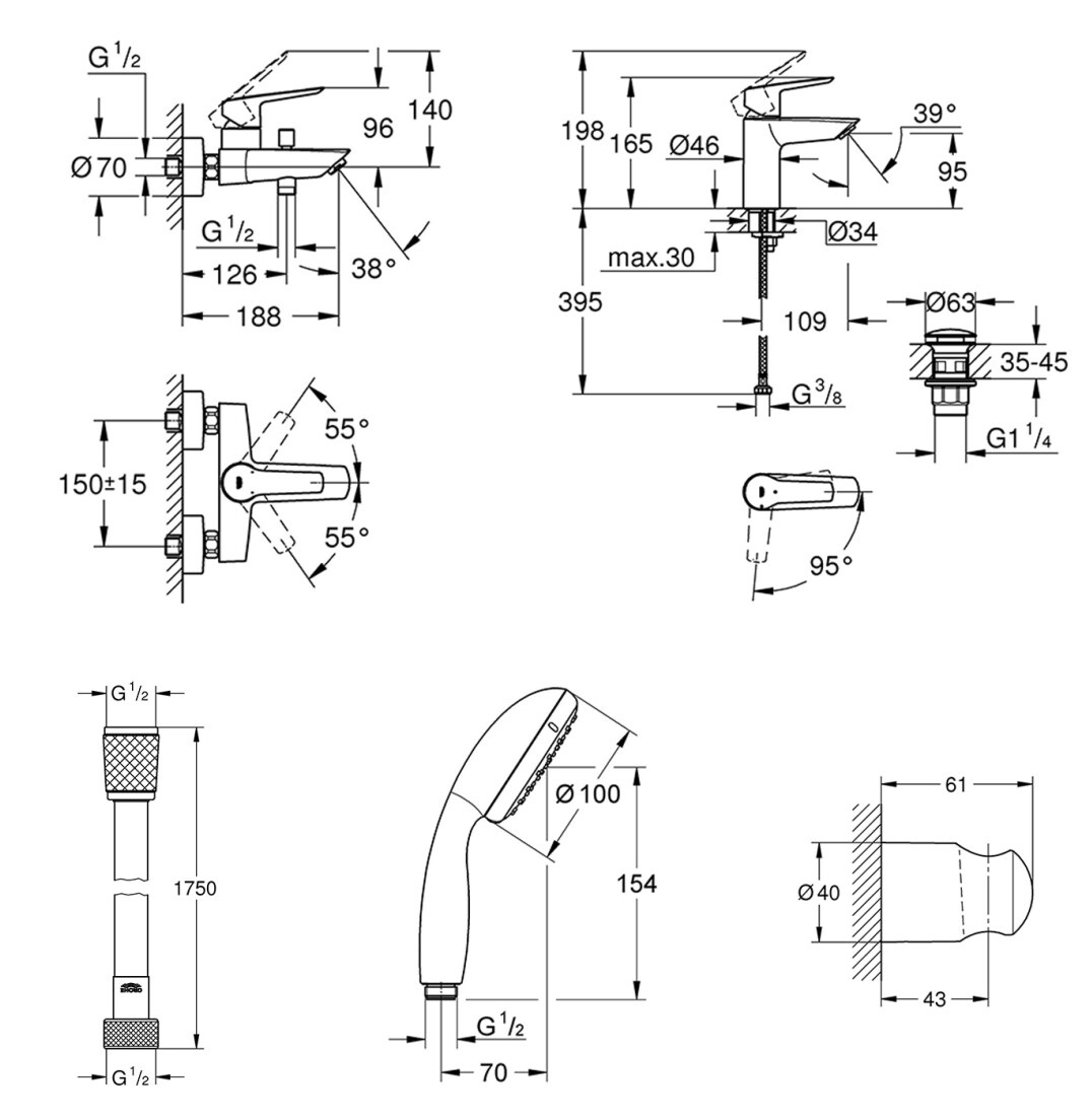 Смеситель для раковины, смеситель для ванны, душевая стойка, лейка для ручного душа, душевой шланг, донный клапан, крепление, инструкция.