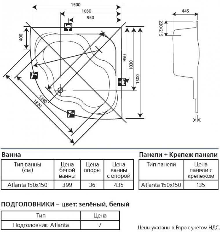 Панель для ванны KOLLERPOOL ATLANTA 150x150. Производитель Koller Pool Австрия.