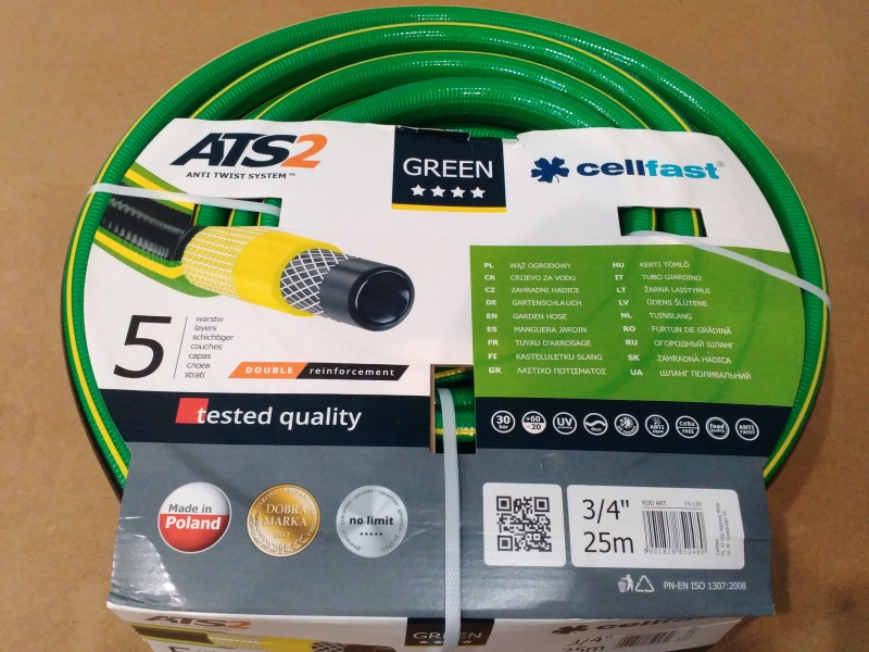 Шланг для полива Cell fast Green 3/4 (25 м). Пятислойный шланг. Внутренний слой сделан из материала, подходящего к контакту с пищей. Шланг не скручивается и не завязывается узлами, которые блокируют струю воды. Двойная крестово – трикотажная оплетка ATS сделана из полиэстровой пряжи высокого качества. Невосприимчив к лучам УВ и к осадкам водорослей внутри шланга. Свободный от кадмия, бария и свинца. Пределы температуры -20/+60С. Метраж в бухте 25 м. Диаметр 18 мм.