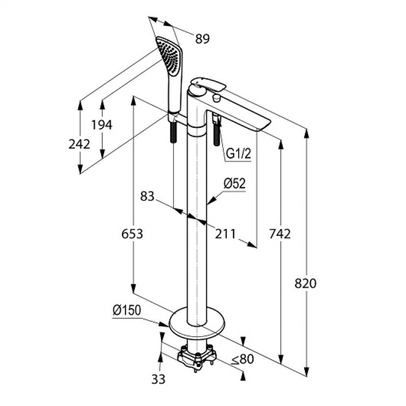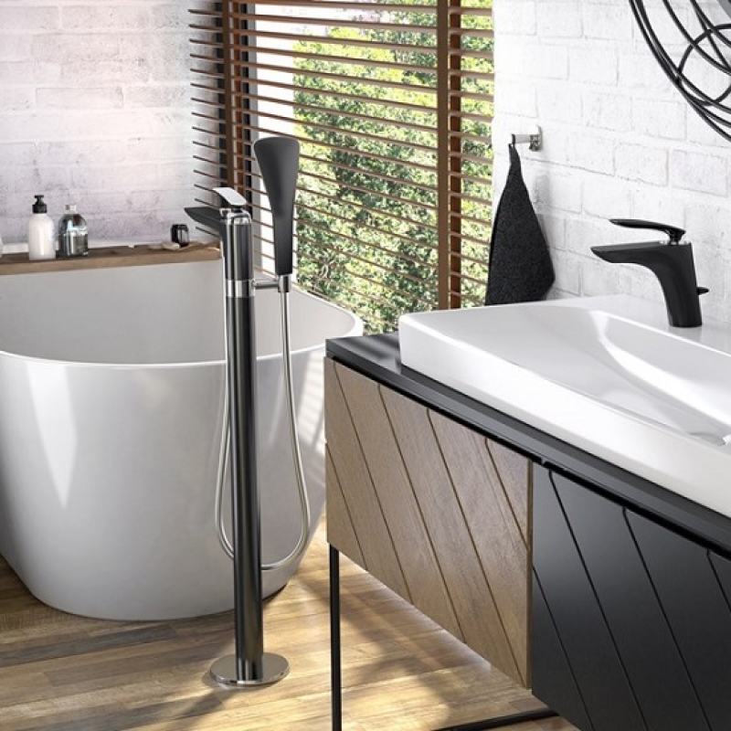 Однорычажный смеситель для ванны и душа DN 15, монтаж у отдельно стоящих ванн, литой рычаг, керамический картридж с ограничителем горячей воды, ламинарный аэратор s-pointer Cache M 24 x, класс расхода воды В/В, автом. переключатель душ/ванна, клапан защиты от обратного потока, шланг KLUDI SUPARAFLEX SILVER/WHITE с двусторонней защитой от скручивания G 1/2 x G 1/2 x 1250 мм, душевая лейка KLUDI FIZZ 1S.
