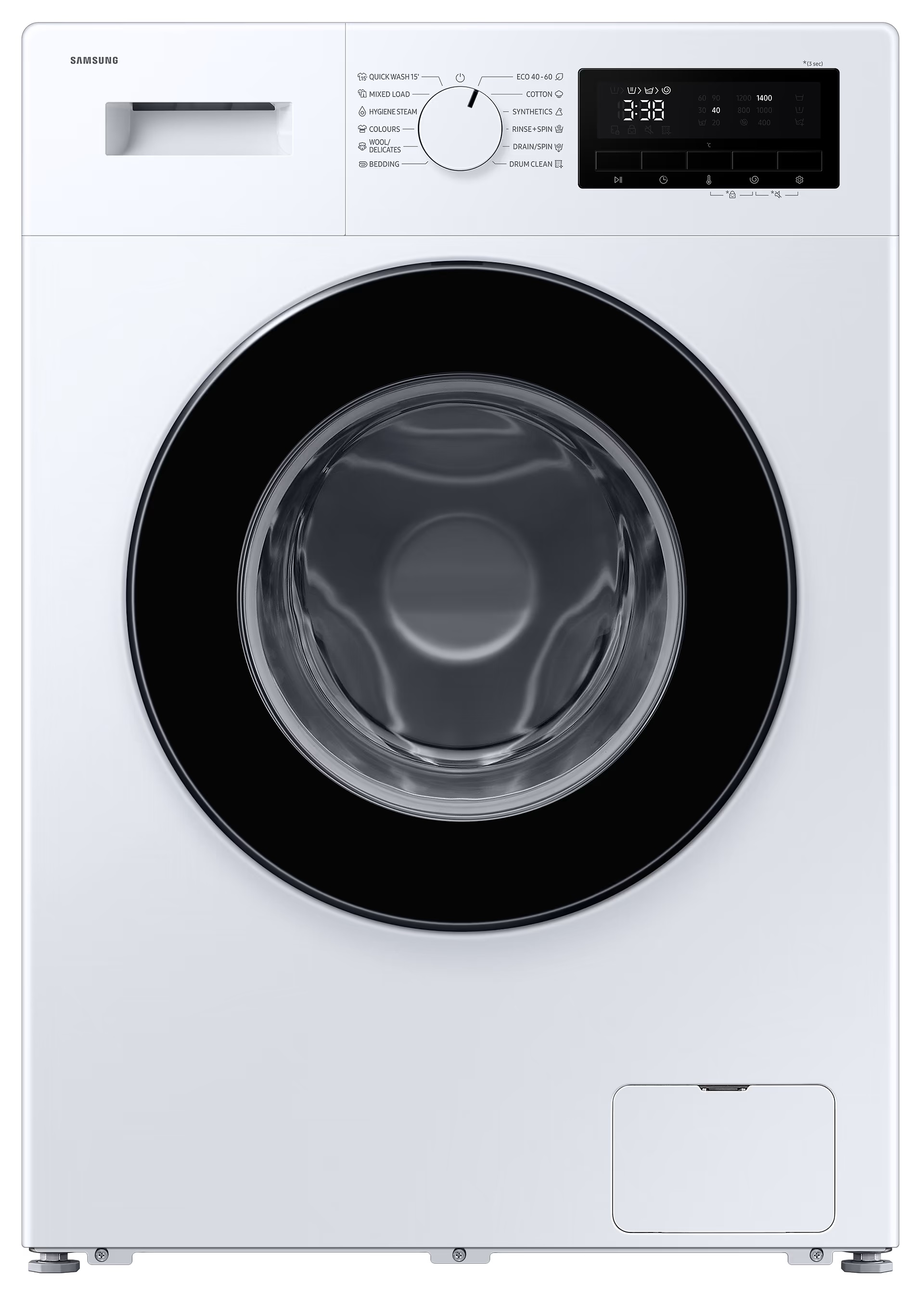 Samsung WW80FG3M05AWLF — это современная фронтальная стиральная машина, которая сочетает высокую эффективность стирки, экономичность и удобство в использовании. Благодаря инверторному двигателю Digital Inverter прибор работает тихо и надёжно, а функция пара Steam помогает удалять бактерии и аллергены, обеспечивая свежесть и гигиеничность белья.