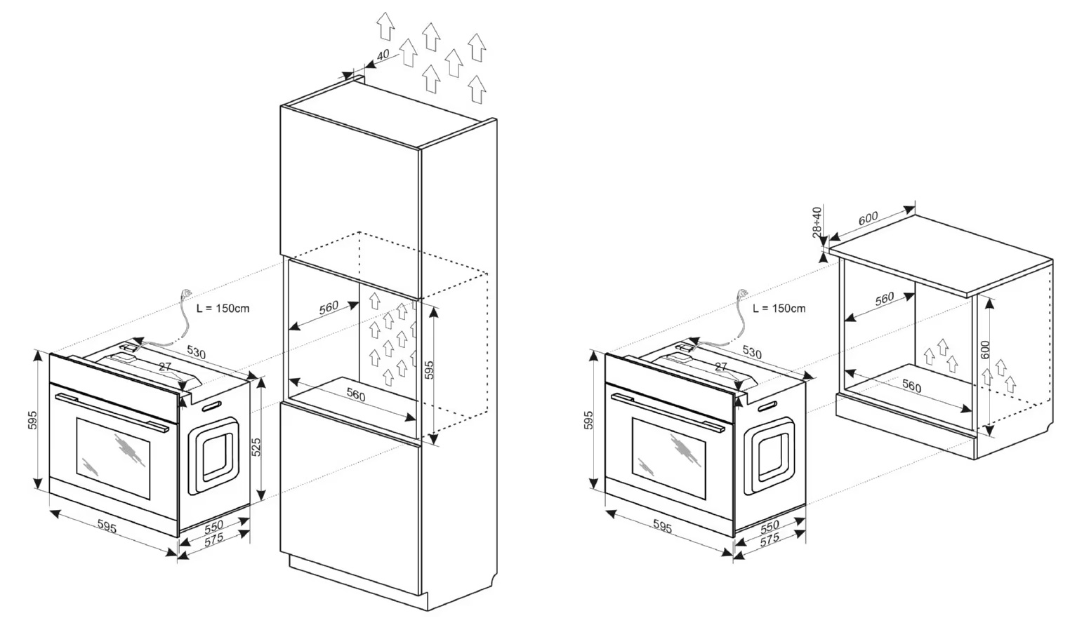 - ▪ Вбудовування: 59,5 × 56 × 56 см