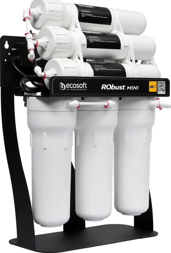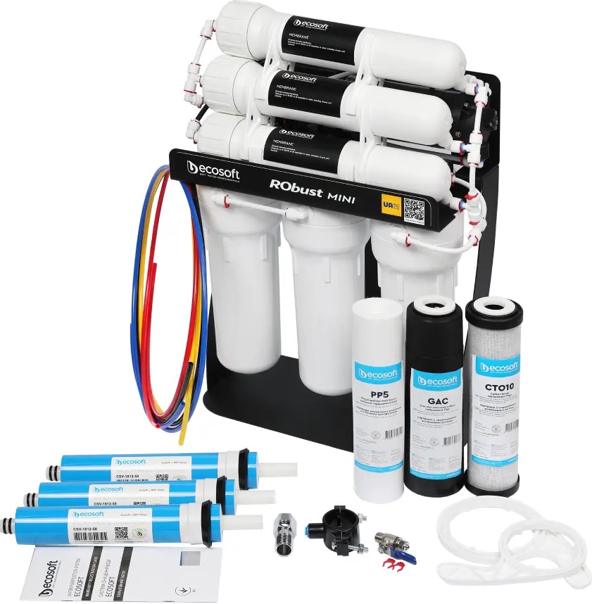 Фільтр зворотного осмосу Ecosoft RObust Mini ROBUST1000STD — це прямоточна система стандартних розмірів із продуктивністю до 1440 л/добу (60 л/год). Рішення для кафе, ресторанів, кав’ярень, АЗС, офісів, шкіл і магазинів, де потрібна постійна подача чистої та безпечної води для приготування страв і напоїв. Технологія зворотного осмосу забезпечує бар’єр навіть для вірусів і бактерій.