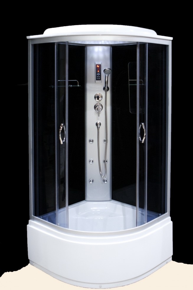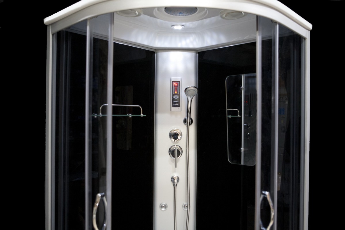 • Комлектація:сенсорна панель управління, підсвічування, тропічний і ручний душ, дзеркало, 6 форсунок, змішувач-перемикач, сифон, поличка, витяжка