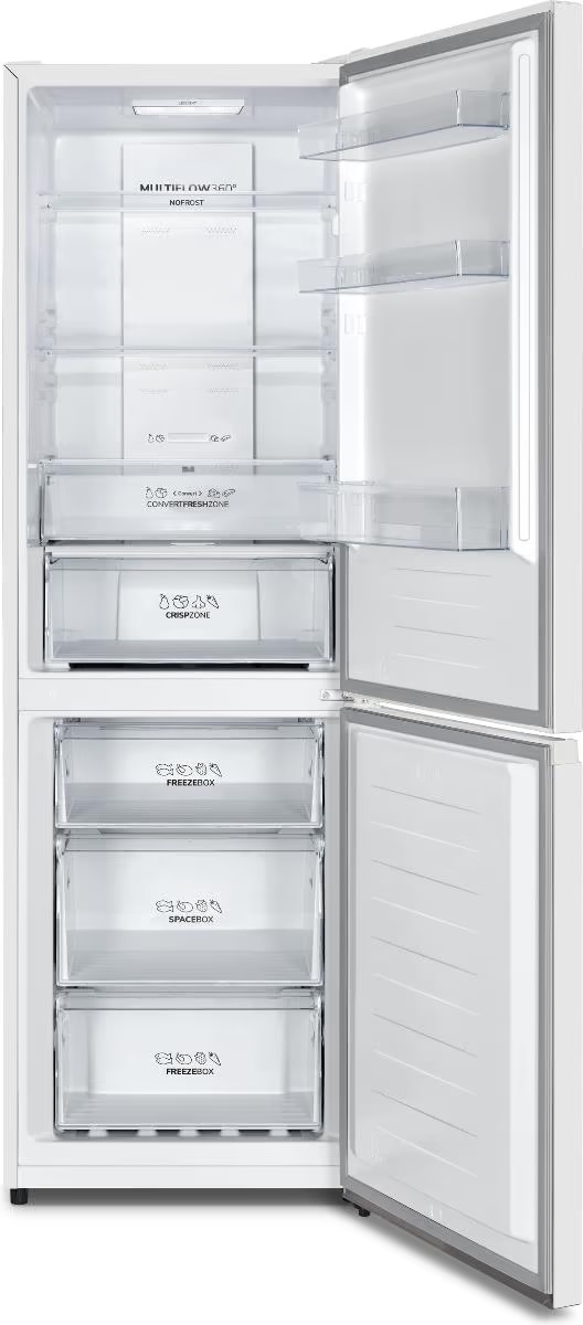 No Frost у холодильній та морозильній камерах запобігає утворенню льоду, підтримує рівномірну циркуляцію холодного повітря та усуває необхідність ручного розморожування. Сенсорне керування та зовнішній LED-дисплей забезпечують зручне налаштування температури, а лаконічний білий корпус добре поєднується з сучасним кухонним інтер’єром.