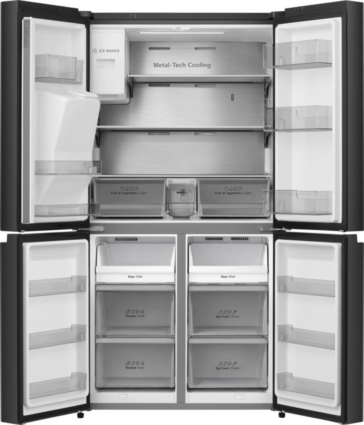 HISENSE RQ7P522STFE — окремостоячий холодильник із загальним корисним об’ємом 540 л, створений для великої родини або тих, хто звик робити запас продуктів наперед. Холодильна камера об’ємом 352 л та морозильна на 188 л дозволяють зручно розподілити продукти різних категорій. Повна система No Frost у двох камерах усуває необхідність ручного розморожування, а чорний корпус із прихованими вертикальними ручками формує виразний сучасний вигляд.