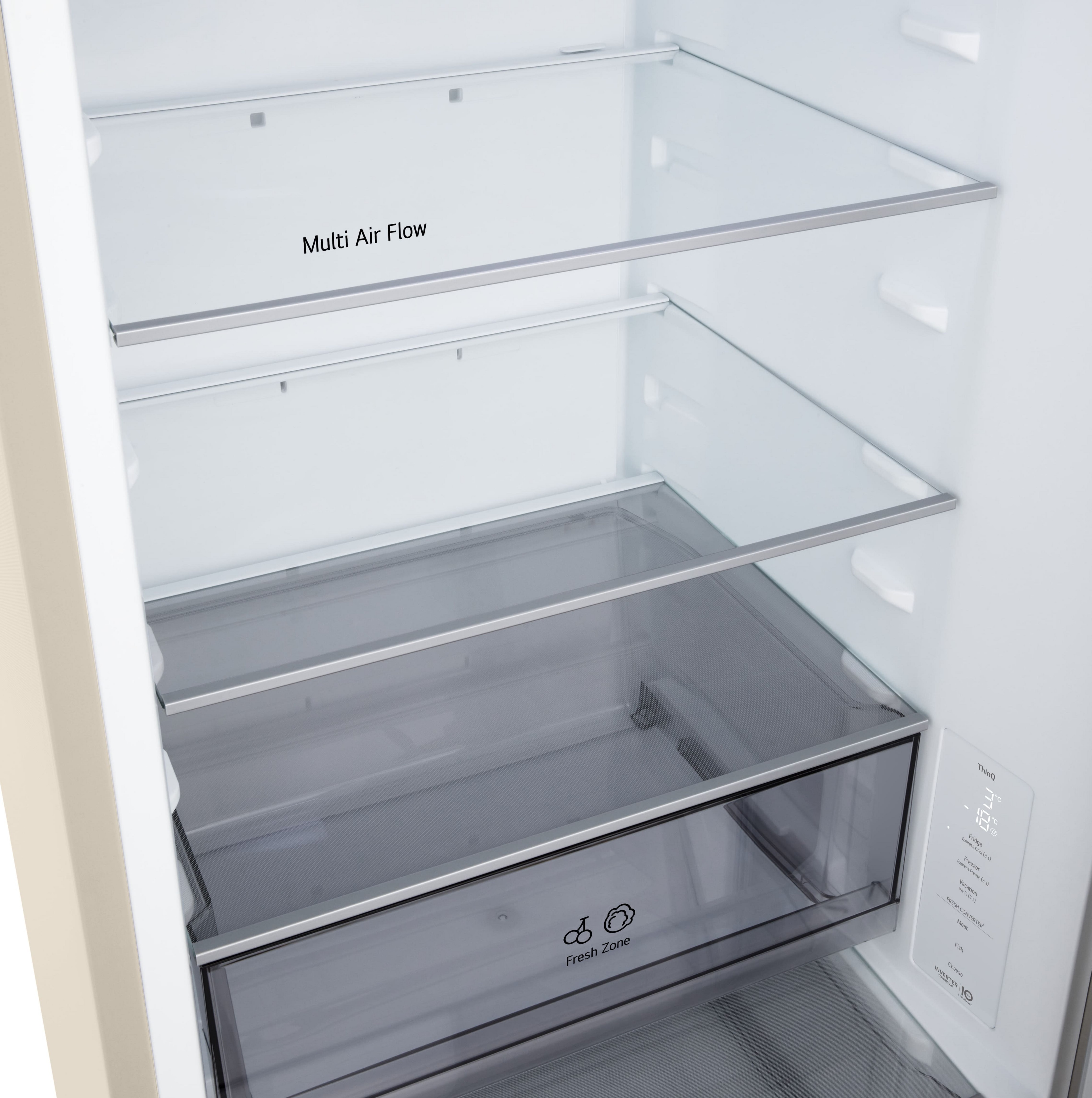 LG GC-B459EEYM — окремостоячий двокамерний холодильник із загальним корисним об’ємом 333 л, що поєднує повну систему No Frost, інверторний компресор та сучасні технології керування через Wi-Fi. Об’єм 220 л у холодильній камері та 113 л у морозильній дозволяє зручно розмістити продукти для родини, а рівень шуму 35 дБ забезпечує тиху роботу в житловому просторі. Бежевий колір і приховані горизонтальні ручки формують акуратний зовнішній вигляд.