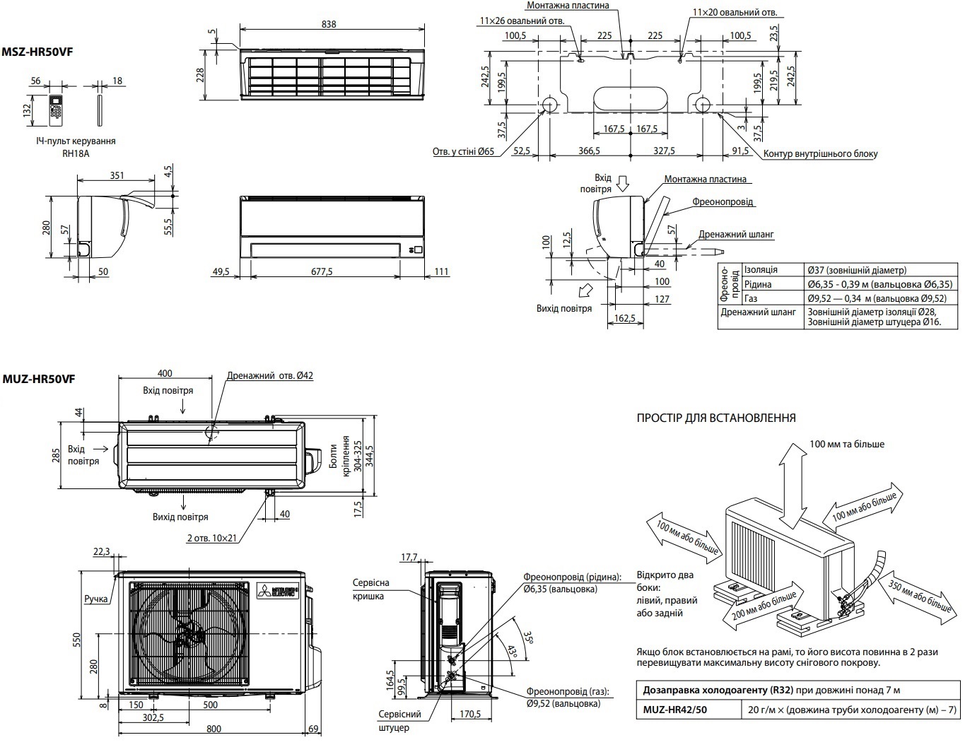 | Діаметр труб (рідина / газ) мм(дюйм) | 6.35(1/4") / 9.52(3/8") |