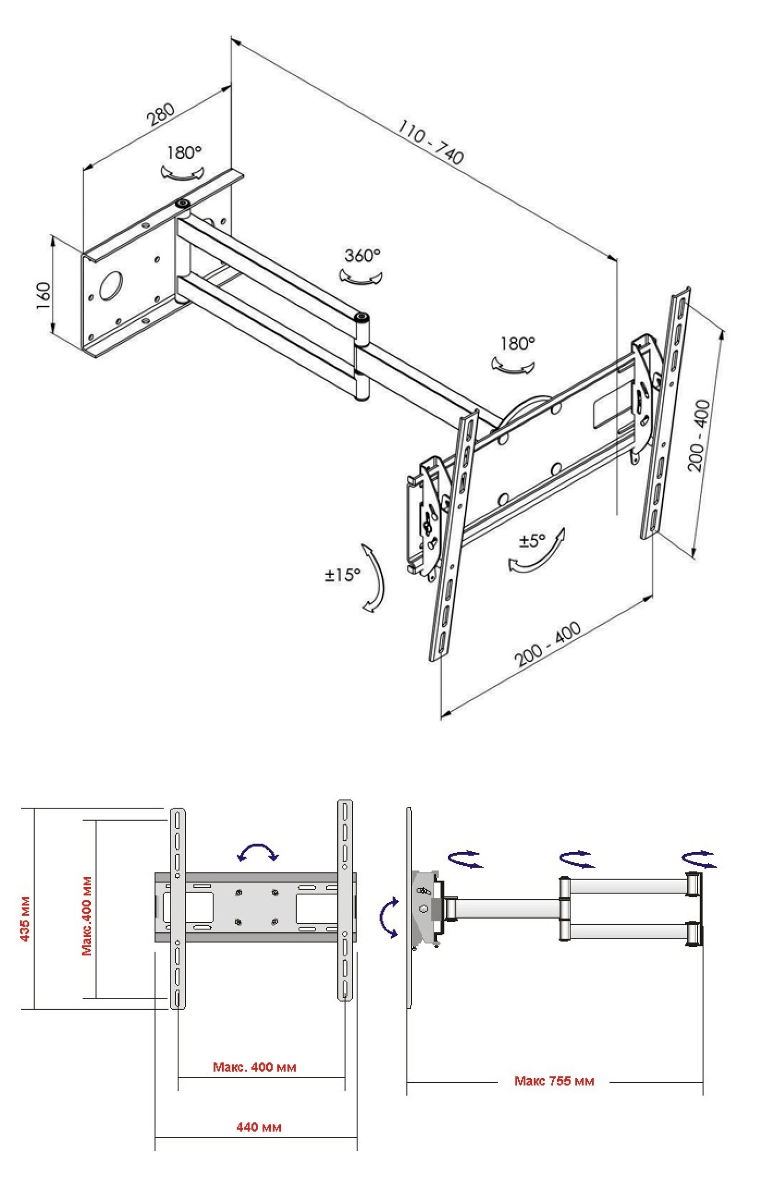 Кронштейн забезпечує значний винос від стіни — до 740 мм, має три вузли повороту 180°/360°/180° та вузол нахилу ±15°, що дозволяє легко налаштувати кут огляду.