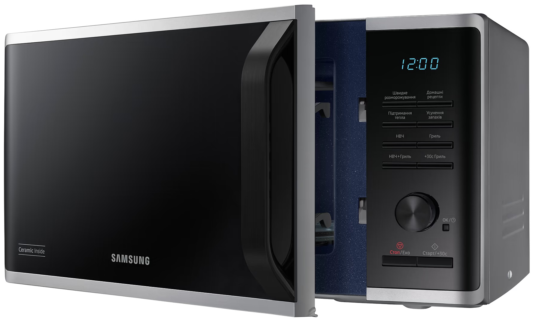 Ця модель поєднує стильний сріблястий дизайн, зручність використання та сучасні функції. Завдяки грилю, режиму експрес-розморожування та спеціальному покриттю CERAMIC INSIDE™ ви отримаєте більше можливостей для щоденного приготування смачних страв.