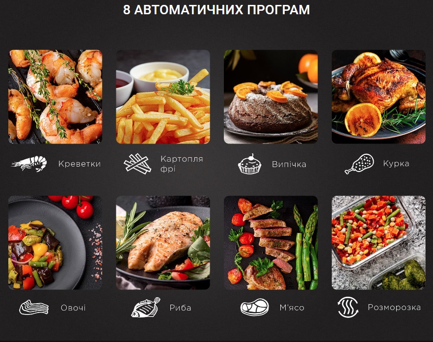 - 8 автоматичних програм: включають мʼясо, овочі, рибу, курку, картоплю фрі, випічку, креветки, розморожування.