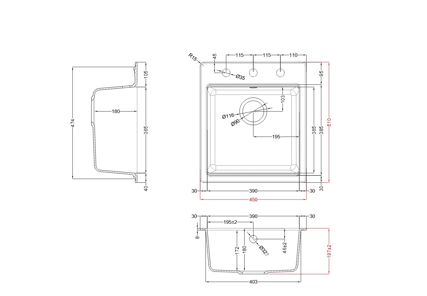 - ▪ База під мийку: 450 мм