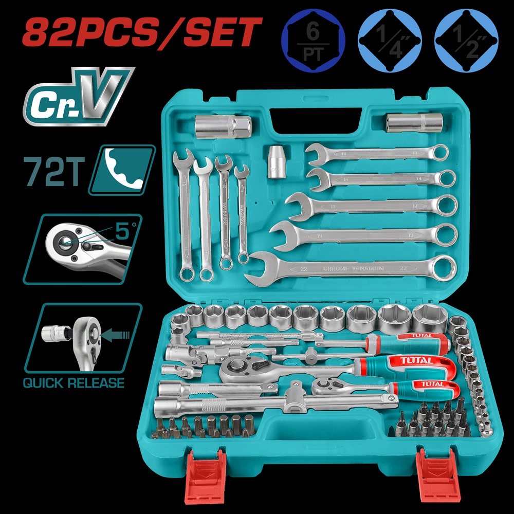 Набір інструментів TOTAL THT121201 складається із 82 предметів, застосовується для монтажних та демонтажних робіт з різьбовими з'єднаннями. Посадковий квадрат - 1/2"" та 1/4"". Деталі набору виготовлені з термообробленої хромванадієвої сталі, тому здатні витримувати значне навантаження та відрізняються зносостійкістю. До набору входить: