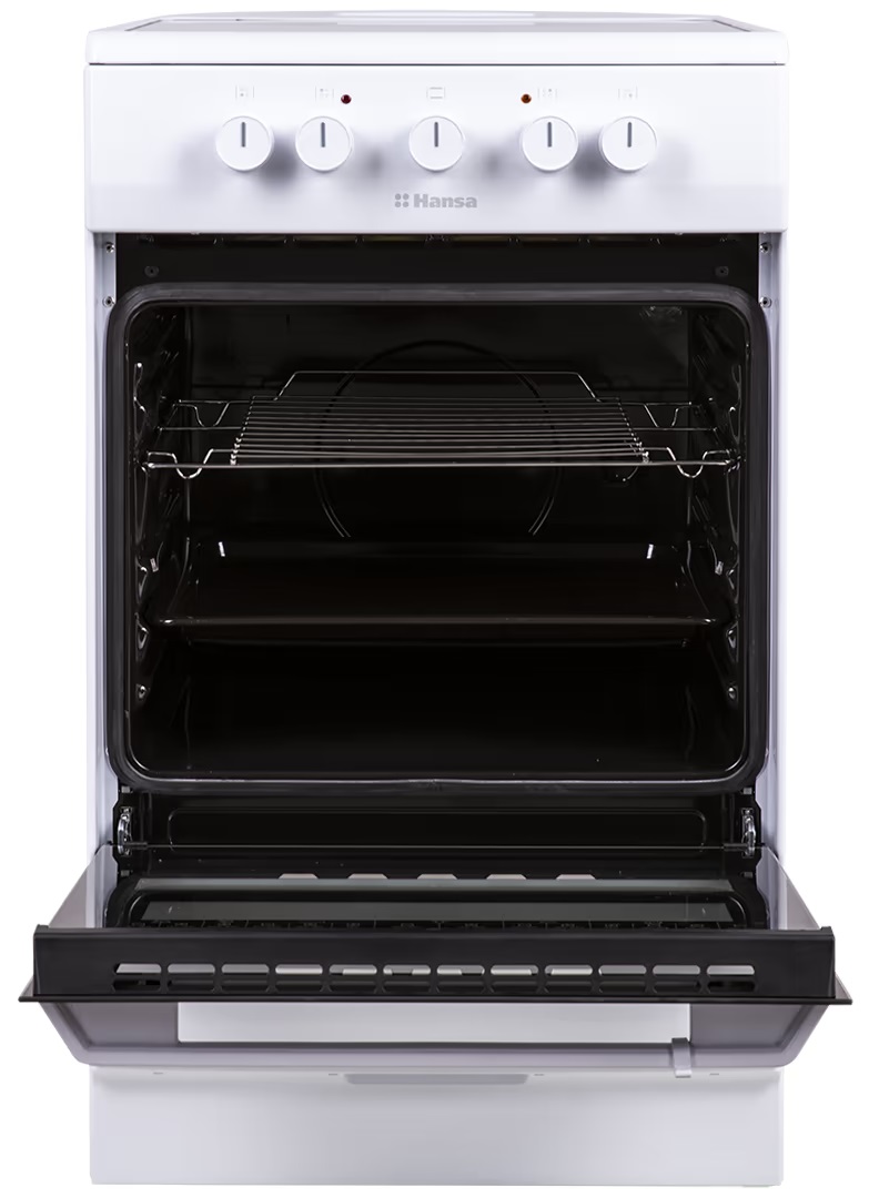 Електрична плита Hansa FCCW53000 поєднує базову функціональність, просте механічне керування та збільшений об’єм духовки — 68 літрів. Склокерамічна поверхня з нагрівальними зонами HiLight забезпечує швидкий нагрів і стабільну температуру, а рельєфні напрямні та з’ємне скло дверцят роблять використання й догляд максимально зручними.