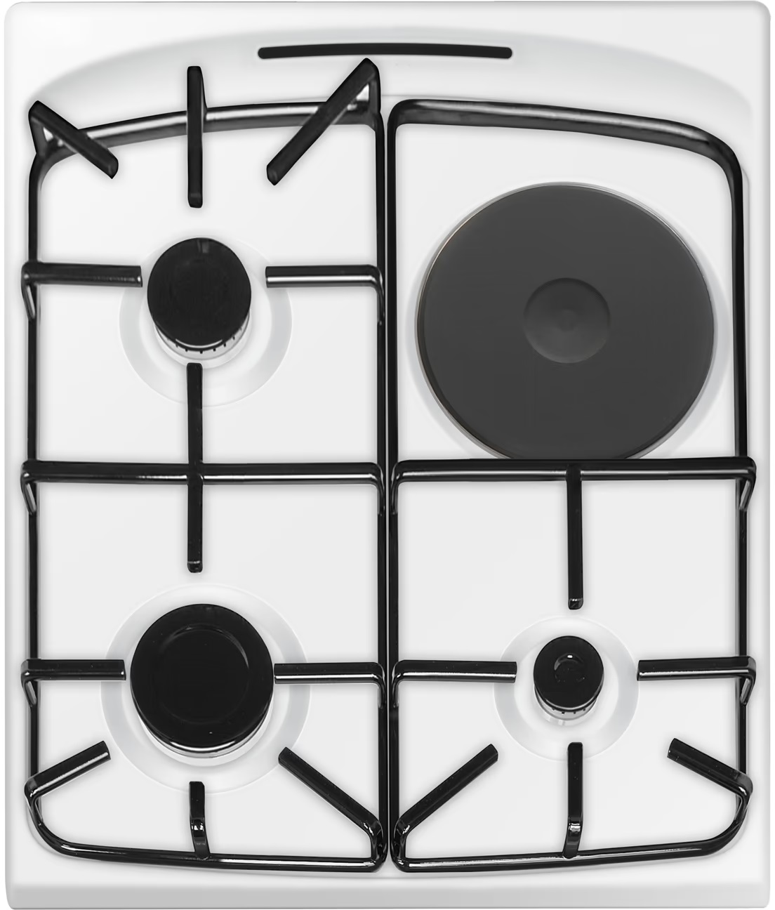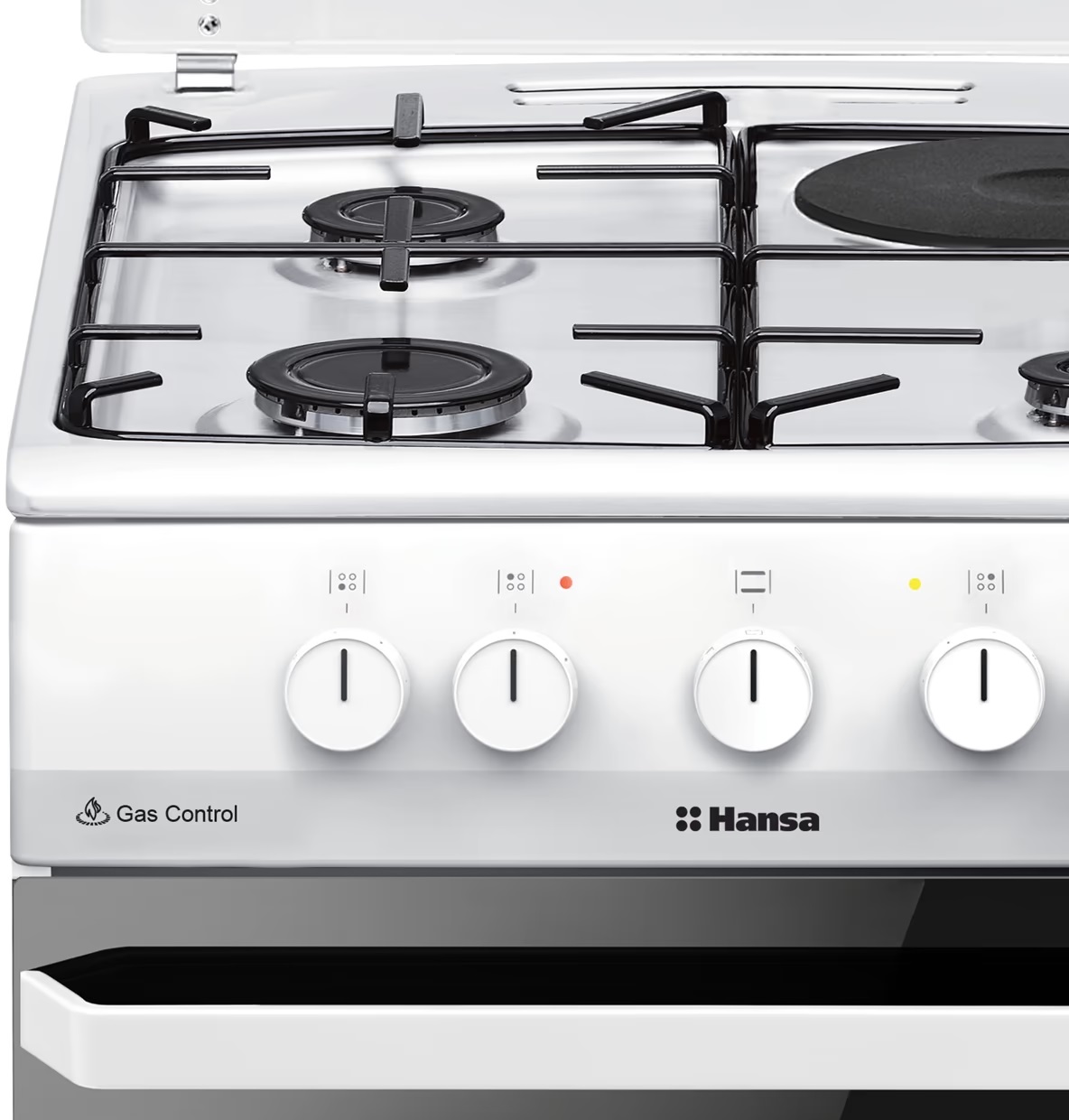 Hansa FCMW54000H — комбінована кухонна плита з газовою варильною поверхнею та електричною духовкою об’ємом 68 літрів, що забезпечує зручність у щоденному приготуванні страв. Завдяки простому механічному керуванню, автоматичному електропідпалу, функції газ-контролю та практичній конструкції ця модель стане надійним рішенням для домашньої кухні.