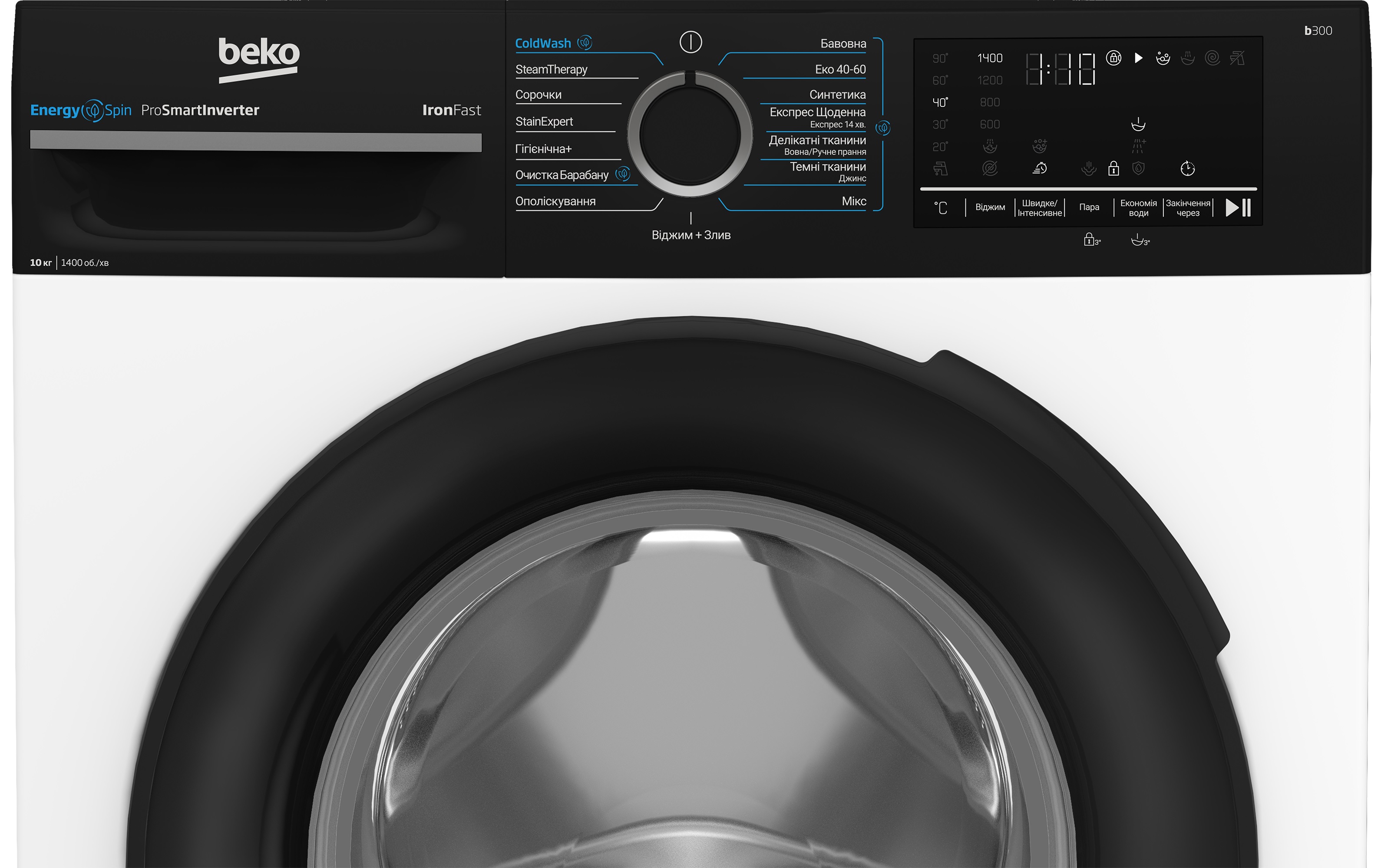 BEKO BM3WFU410415WPBB — це фронтальна пральна машина з великим завантаженням 10 кг, інверторним двигуном ProSmart та інтелектуальною системою прання OptiSense. Модель поєднує високу швидкість віджиму 1400 об/хв, технологію SteamCure та барабан AquaWave для дбайливого догляду за тканинами. Білий корпус із чорною кромкою люка виглядає сучасно, а україномовний інтерфейс спрощує користування.