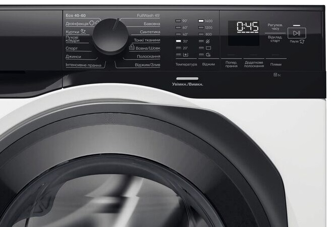 - ▪ Програми прання: FullWash45 ▪ бавовна ▪ синтетика ▪ тонкі тканини ▪ вовна/шовк ▪ полоскання ▪ віджим/злив ▪ інтенсивне прання ▪ джинси ▪ спорт ▪ пухові ковдри ▪ куртки ▪ гігієна (дезінфекція) ▪ еко 40–60 °C