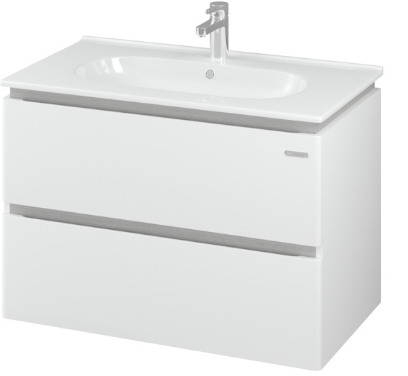 Підвісна тумба з умивальником. Ширина: 810 мм. Висота 575 мм. Глибина 460 мм. Матеріал МДФ. У даній колекції кілька ключових відмінностей: першокласний імпортний керамічний умивальник (Туреччина), внутрішнє наповнення ящиків у кольорі темно-сірий графіт, білі рейлінги, товсті фасади з 19мм МДФ, боковини МДФ, декоративна вставка RENOLIT (Німеччина). Країна походження України.