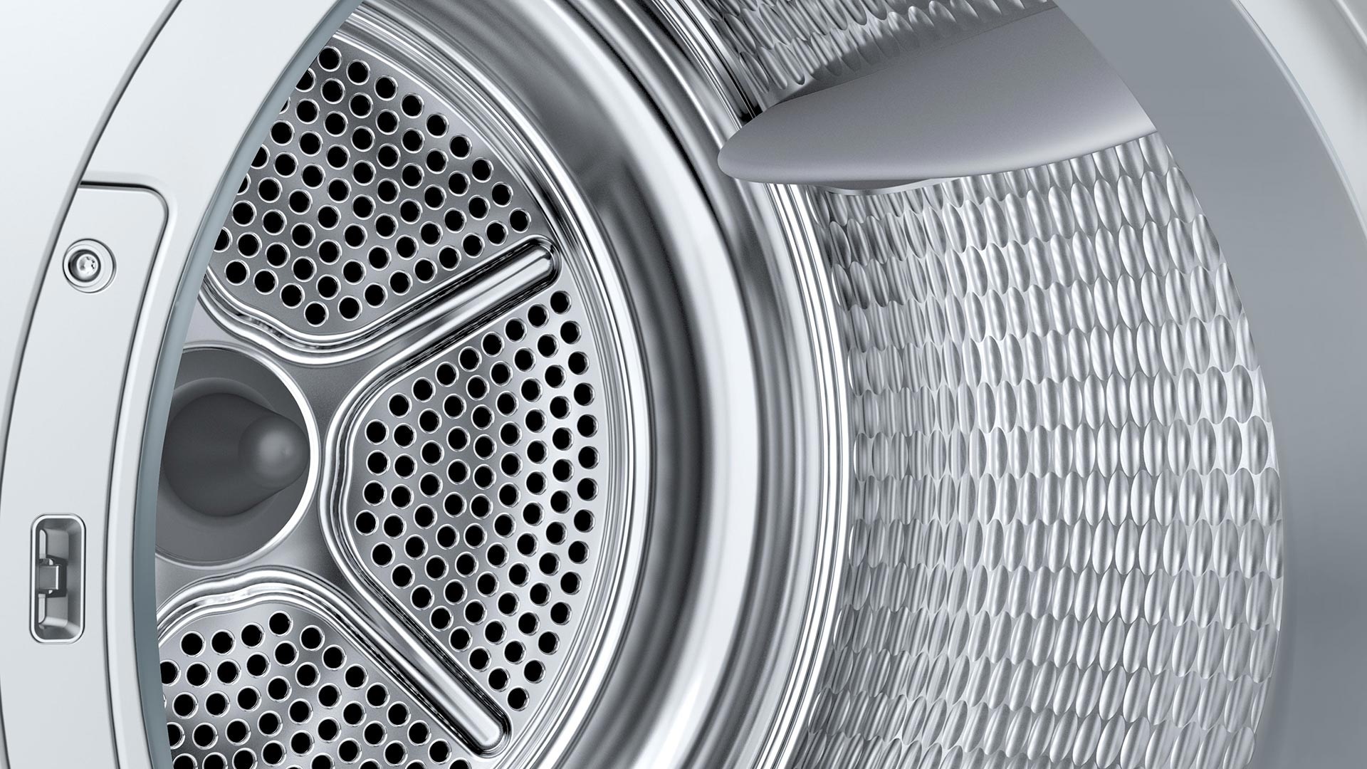 SensitiveDrying рівномірно розподіляє тепло, а антизминальна функція зберігає свіжість і гладкість білизни. Антивібраційні стінки знижують рівень шуму до