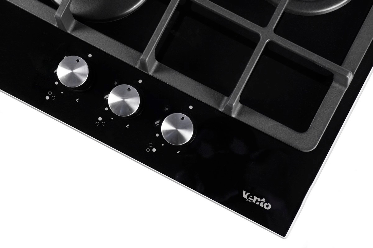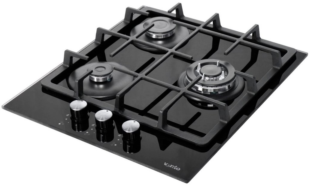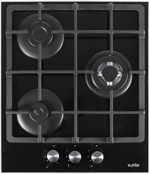 Модель виготовлена зі скла у стильному чорному кольорі. На столі розташовано 3 газові конфорки, потужність яких від 1 до 3 кВт. Чому саме 3 конфорки? Все просто. Споживачі дуже рідко використовують відразу 4 конфорки, 1-2 рази на рік, а прибравши одну з конфорок, знизили ширину моделі на 15 см, тим самим залишивши додаткове місце. А його вже можна використовувати для іншої техніки, яка не містилася або легко створити більш широку зручну зону для приготування.