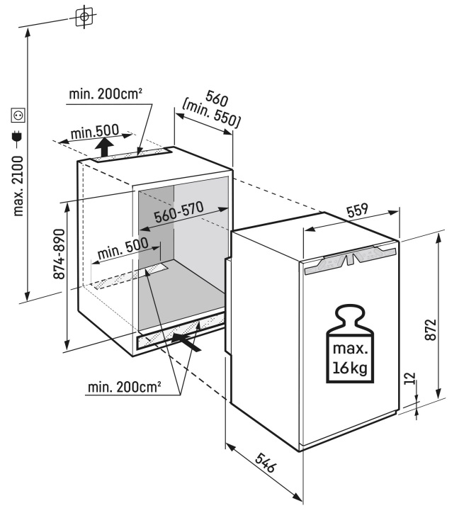 - Тип встановлення: Вбудований (вентиляція через меблі)