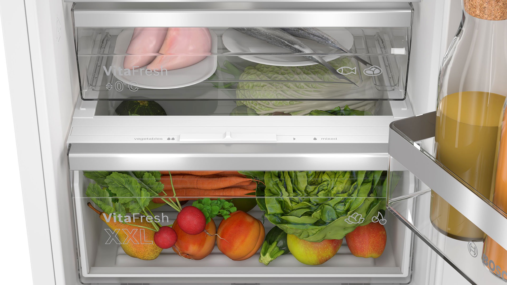 Bosch KIN96VFD0 із серії 4 — це великий вбудований холодильник із нижньою морозильною камерою та збільшеним на 11% об’ємом охолодження. Завдяки сучасним технологіям VitaFresh XXL <0°C>, NoFrost і системі електронного контролю температури ця модель гарантує оптимальне зберігання продуктів у свіжості та безпеці.