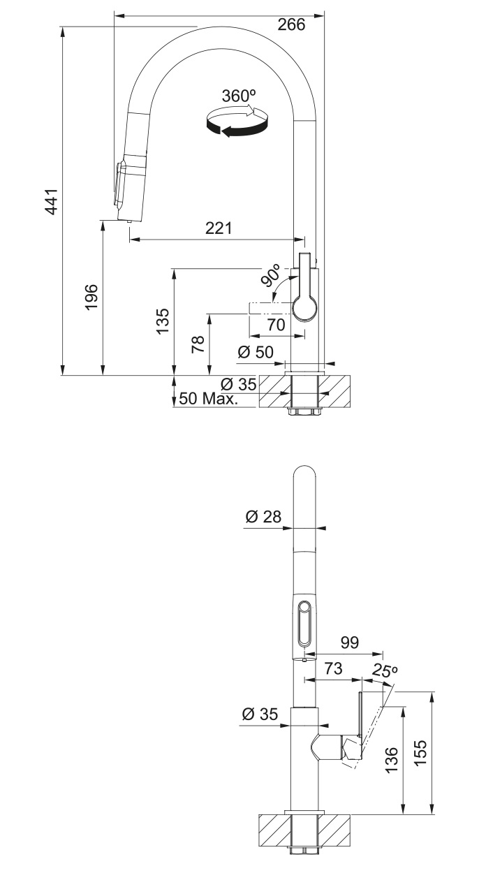 Змішувач з поворотним витяжним виливом з під'єднанням до системи фільтрації води, в тому числі зі зворотним осмосом. Витяжний вилив дозволяє зручно мити всю поверхню мийки та наповнювати посуд, який розміщений поза її межами. Важіль відкривається вперед на кут 90°, тому можна здійснювати монтаж впритул до стіни. Кут повороту виливу складає, 360° тому водяний потік досягає більшої площі мийки, а також такий змішувач можна монтувати в острівні кухні. Аератор насичує водяний потік повітрям, завдяки чому краще працюють миючі засоби а також економиться вода.