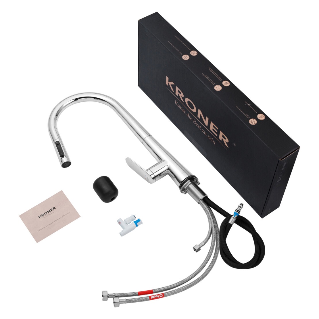 Kroner Element 211569-0101 — це продуманий кухонний змішувач із подачею питної води, висувним виливом і якісними комплектуючими. Модель поєднує практичність, надійність і зручність у щоденному використанні, що робить її універсальним вибором для сучасної кухні.