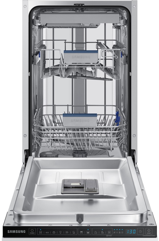 Встраиваемая посудомоечная машина Samsung DW50DG450B00UA — это узкая модель шириной 45 см, созданная для современных кухонь, где важны экономичность, тишина и удобство. Она вмещает до 10 комплектов посуды, потребляет всего 9 литров воды за цикл и обеспечивает качественную мойку с энергоэффективностью класса D (A++).