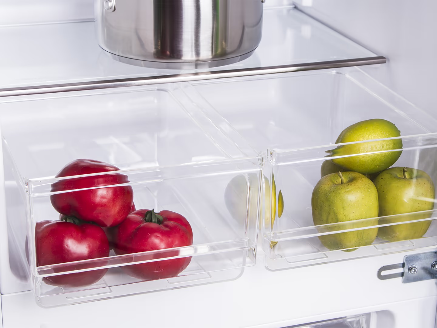 В морозильном отделении вы найдет три вместительных пластиковых контейнера разного размера для размещения овощей и фруктов, мяса и рыбы, десертов и полуфабрикатов.