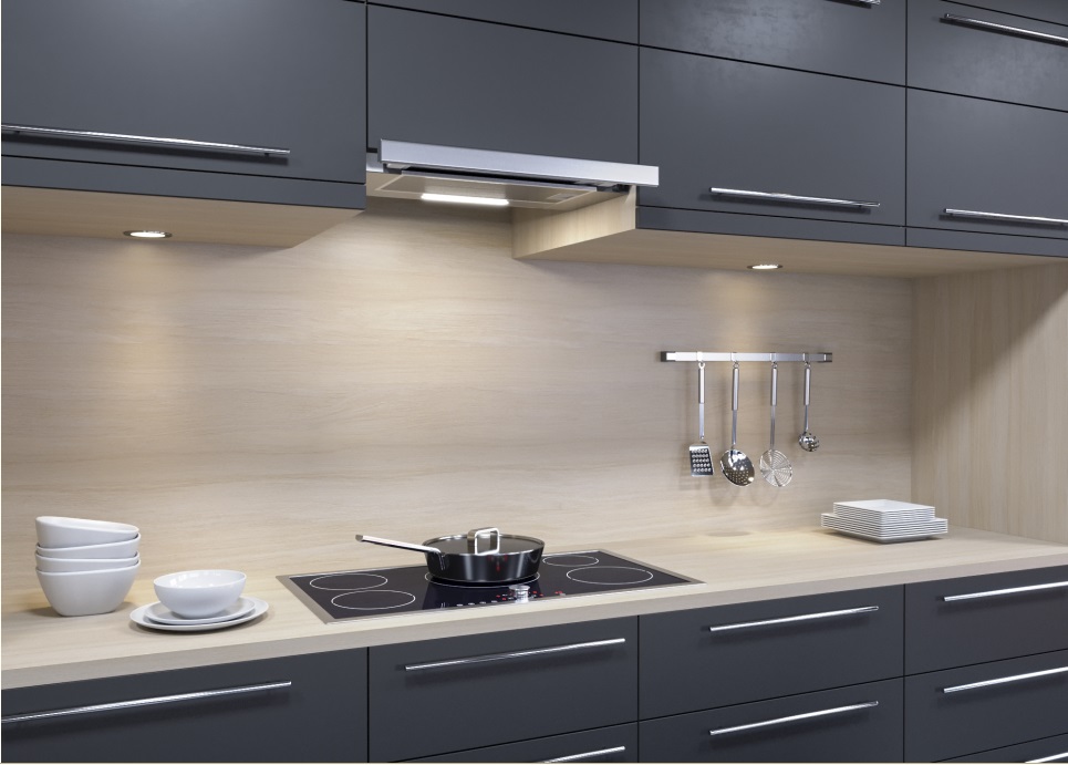 - ▪ Телескопическая конструкция — вытяжка компактно встраивается в шкаф и удобно выдвигается во время работы.