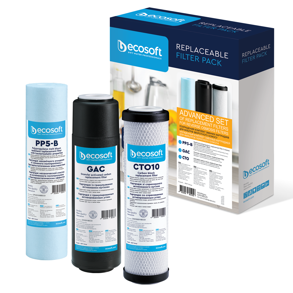улучшенный комплект картриджей Ecosoft 1-2-3 для фильтра обратного осмоса — 4 шт.